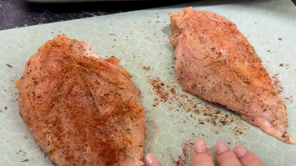 - Then, season the chicken breasts with salt, pepper, and any other spices you like (such as garlic powder, paprika, or dried herbs like thyme).