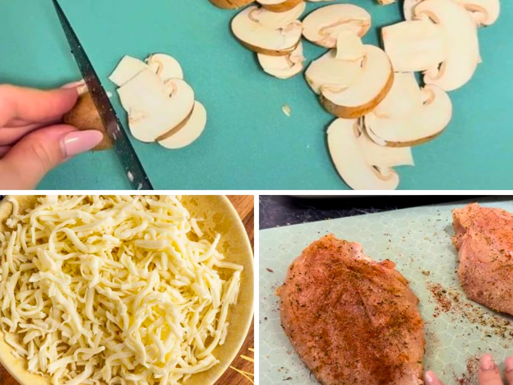 Start by slicing the mushrooms into thin pieces so they cook evenly and quickly. Next, grate the cheese on a fine or coarse grater, depending on your preference. Then, season the chicken breasts with salt, pepper, and any other spices you like (such as garlic powder, paprika, or dried herbs like thyme).