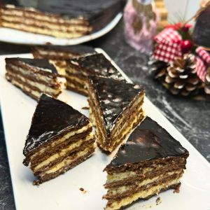 From start to finish, this cake is pure indulgence. It begins with soft chocolate layers, lightly sweetened with cocoa and honey, then baked just enough to hold their tender texture. Between each layer, you’ll find a silky cream filling made with butter, egg yolks, and milk, rich, smooth, and utterly satisfying. To finish, the entire cake is coated in a glossy chocolate glaze that adds the perfect touch of decadence.