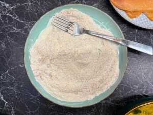 - In the first dish, mix all-purpose flour, black pepper, garlic powder, paprika, and salt. Stir well to distribute the seasonings evenly.