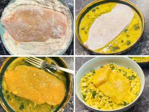 - If the chicken breasts are thick, slice them in half or pound them to an even thickness for faster, even cooking. Dredge each piece of chicken in the flour mixture, coating it completely. Shake off any excess flour. Dip the floured chicken into the egg wash, making sure it’s fully covered. Let any extra egg drip off.