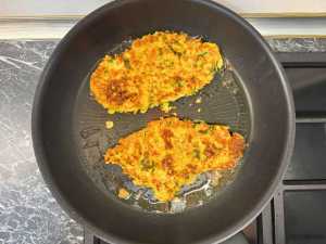 - Carefully place the coated chicken schnitzels into the hot oil. Avoid overcrowding the pan to maintain crispiness.