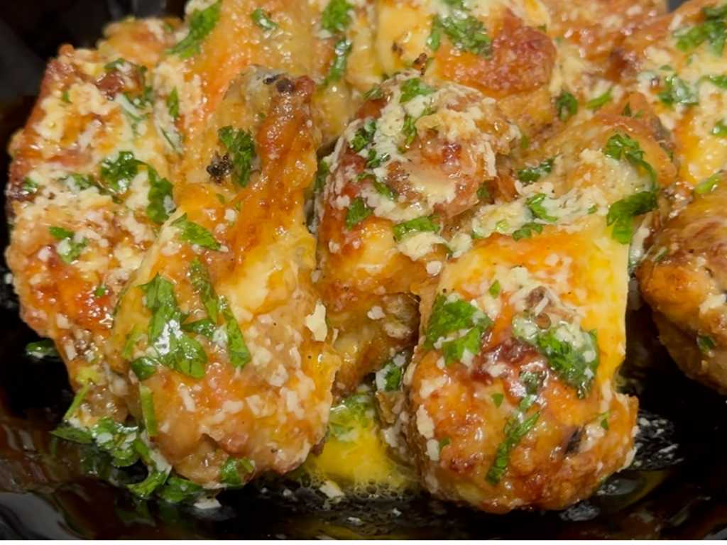- Transfer the crispy wings to a large bowl. Pour the warm Parmesan garlic butter glaze over them and gently toss to coat every piece. Garnish with extra Parmesan and parsley for a final touch, then serve hot and enjoy!