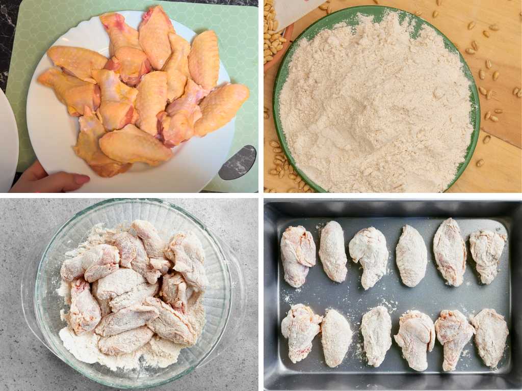 - If the wings are whole, start by cutting off the wing tips and separating the drumettes from the flats. Pat the wings dry with paper towels to remove excess moisture, which helps them get extra crispy. In a bowl, mix flour, garlic powder, paprika, salt, and baking powder (if using). Toss the wings in this mixture until evenly coated, then let them rest for 10 minutes to allow the coating to adhere.