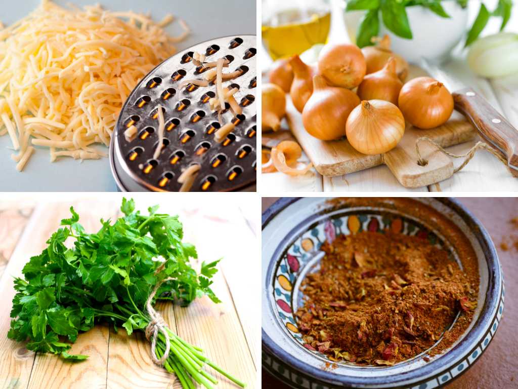 - In a separate bowl, combine the grated cheese, yellow onion, parsley, and ras el hanout. Mix well and set aside.