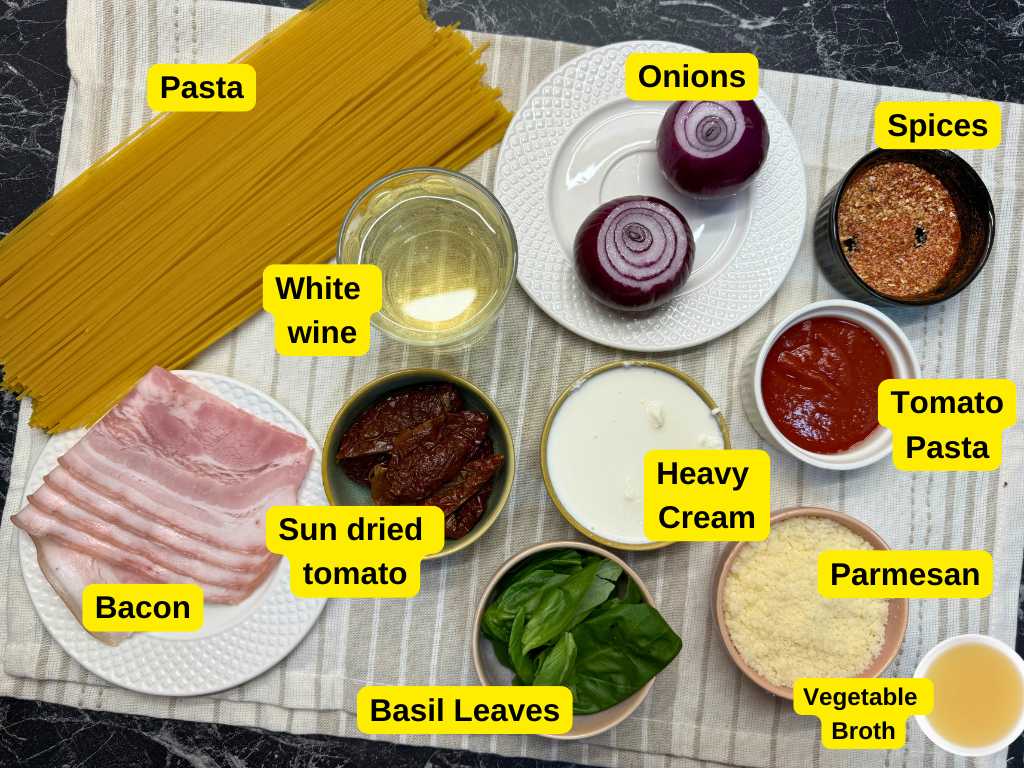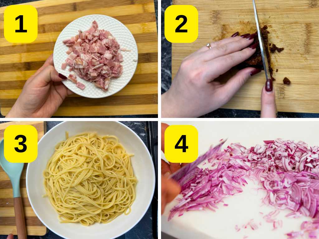 Start by boiling the pasta according to the instructions on the package. While the pasta is cooking, finely chop the onion, sun-dried tomatoes, and basil leaves. Dice the bacon into small pieces as well.