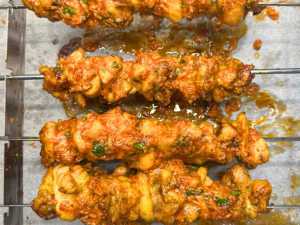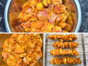 Thread the chicken onto skewers, packing the pieces tightly to ensure maximum juiciness.