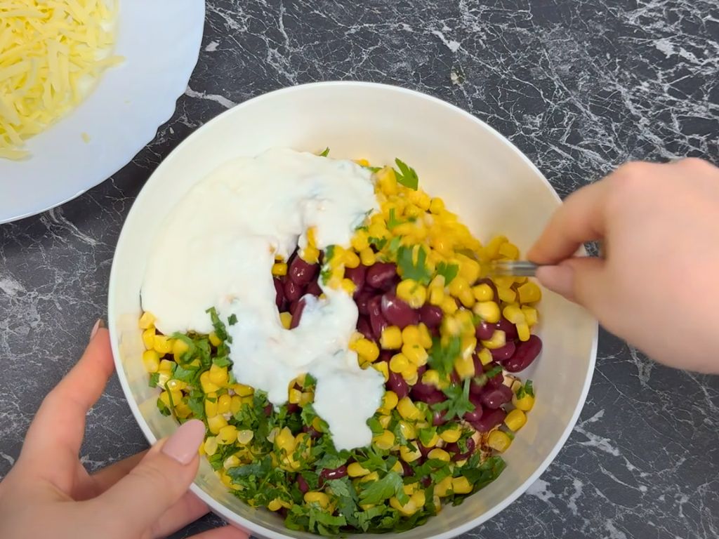 - In a large bowl, add the sliced chicken breast, beans, corn, chopped parsley, and Greek yogurt. Season with salt and pepper to taste. Mix all the ingredients together until well combined, ensuring an even coating of yogurt throughout the mixture.