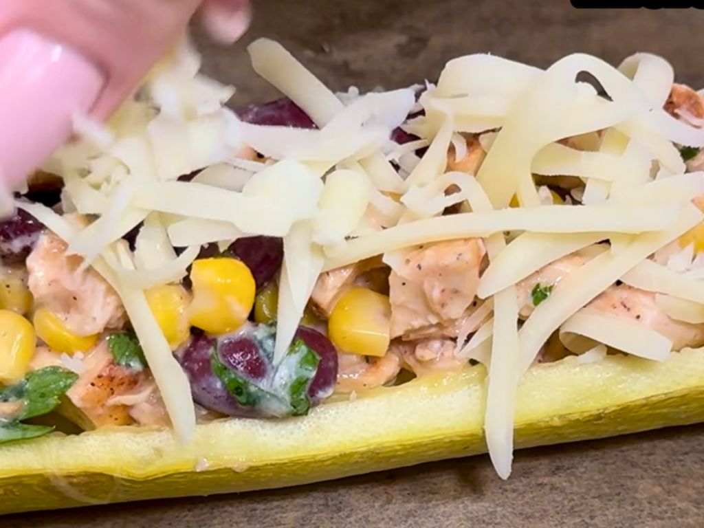 Spoon the prepared chicken and vegetable filling into each zucchini boat, ensuring that they are generously filled. Use a spoon to press the filling down lightly, making sure it is compact. Once all the zucchini boats are filled, sprinkle a generous amount of grated cheese evenly over the top of each one. This will not only add a delicious cheesy flavor but also create a beautiful golden crust as they bake.